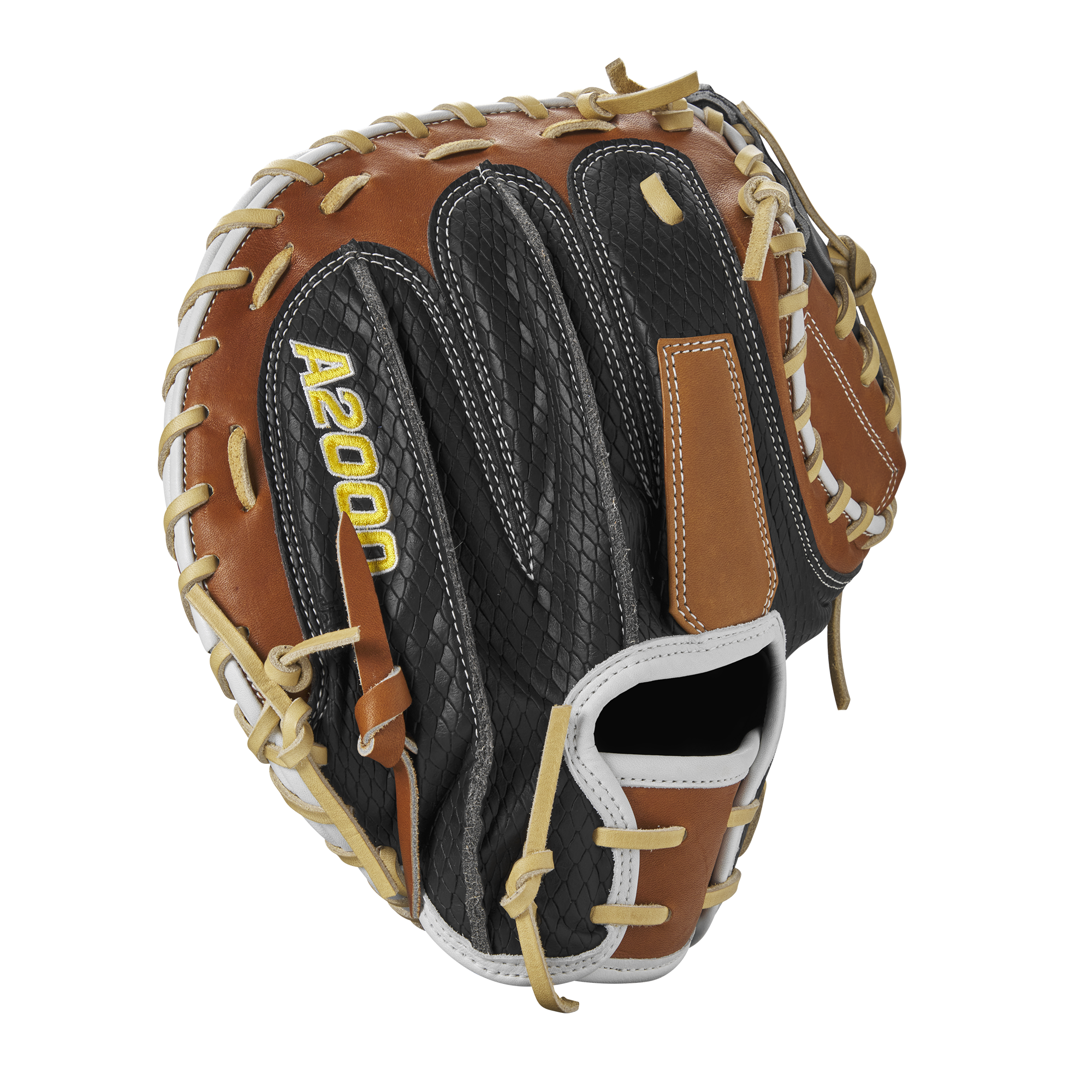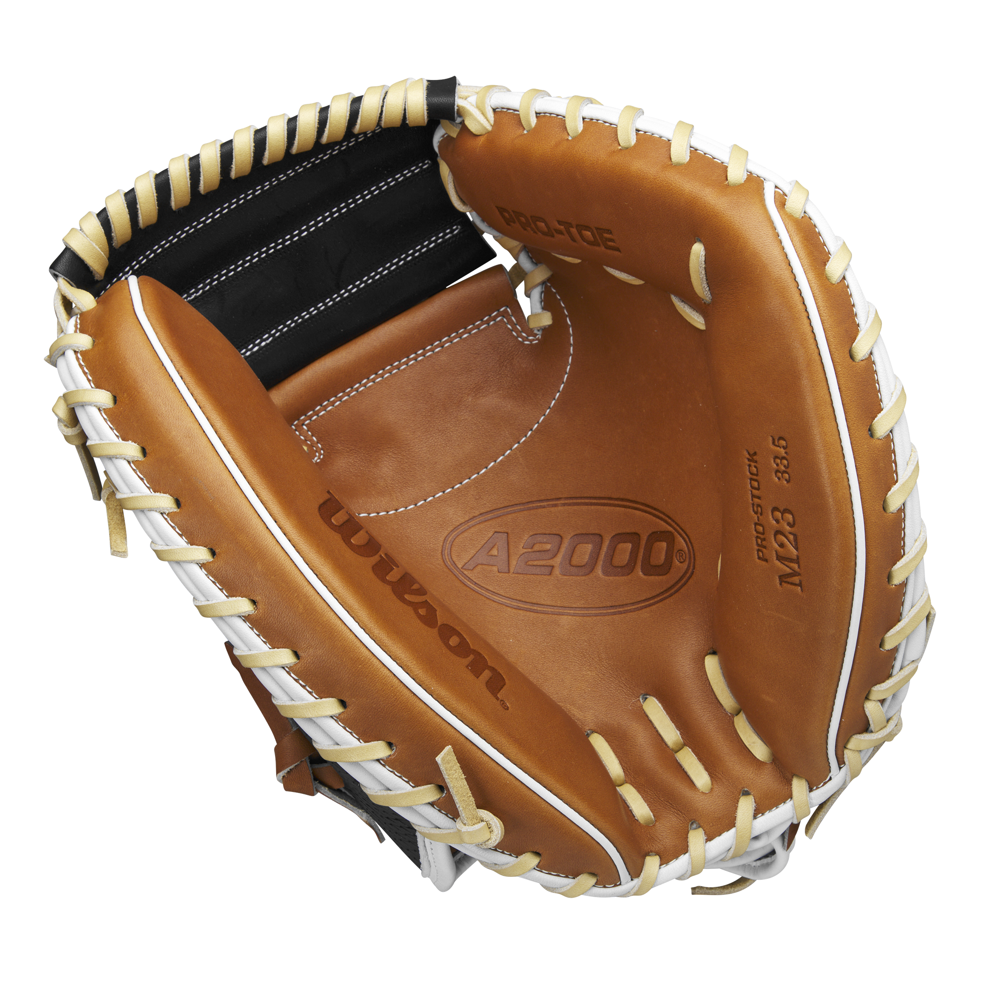 For the modern catcher focused on “thumb-up” catching and pitch framing, the A2000 M23SS Catcher’s Mitt is shaped with thinner toe pads on the thumb and fingers to create a wider catching area. Set up the perfect target for your pitcher and frame strikes on the edge of the zone with the A2000 M23SS, a 33.5” catcher’s mitt with timeless Saddle Tan Pro Stock® leather and lightweight Black SuperSkin™ for total command of the plate. The Half Moon Web on Wilson’s latest catcher’s mitt model features both Black and Saddle Tan Pro Stock® leather, and the extended palm helps advanced catchers receive the ball while calling the perfect game.