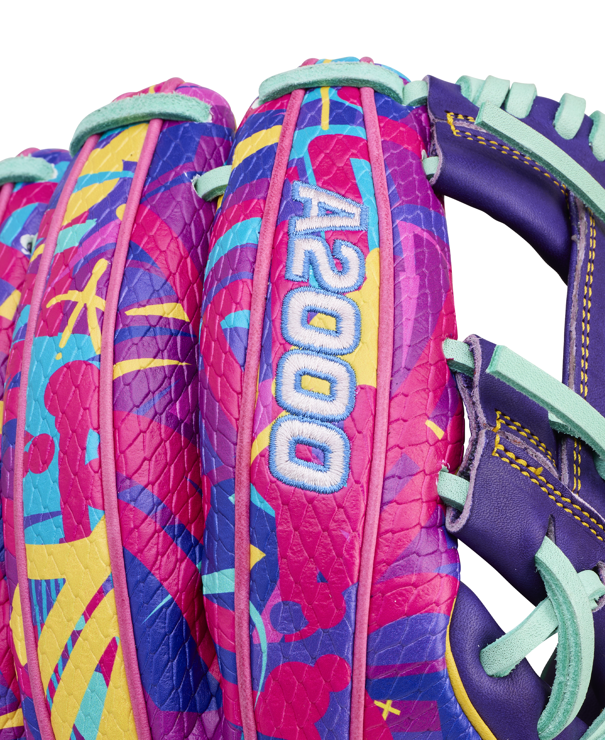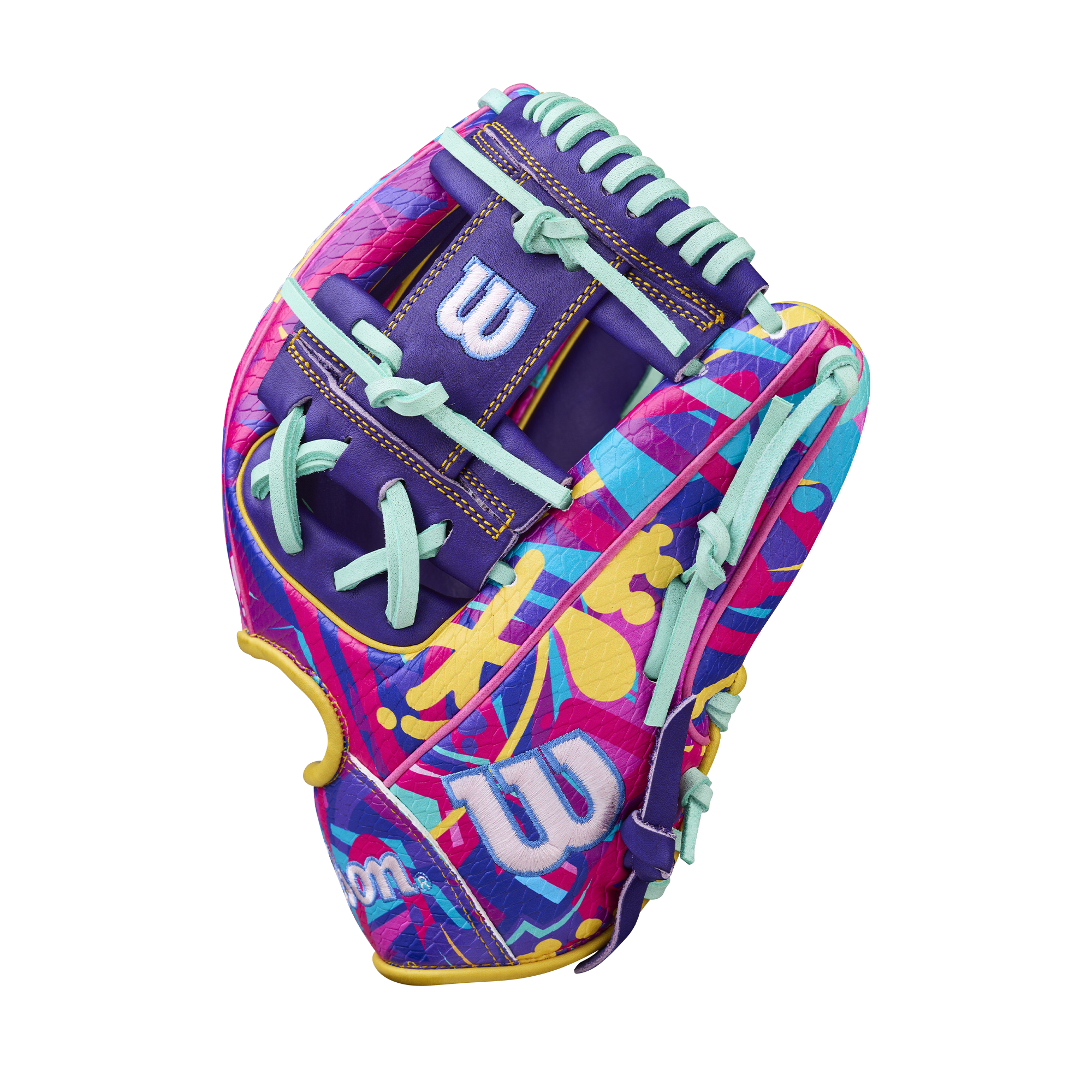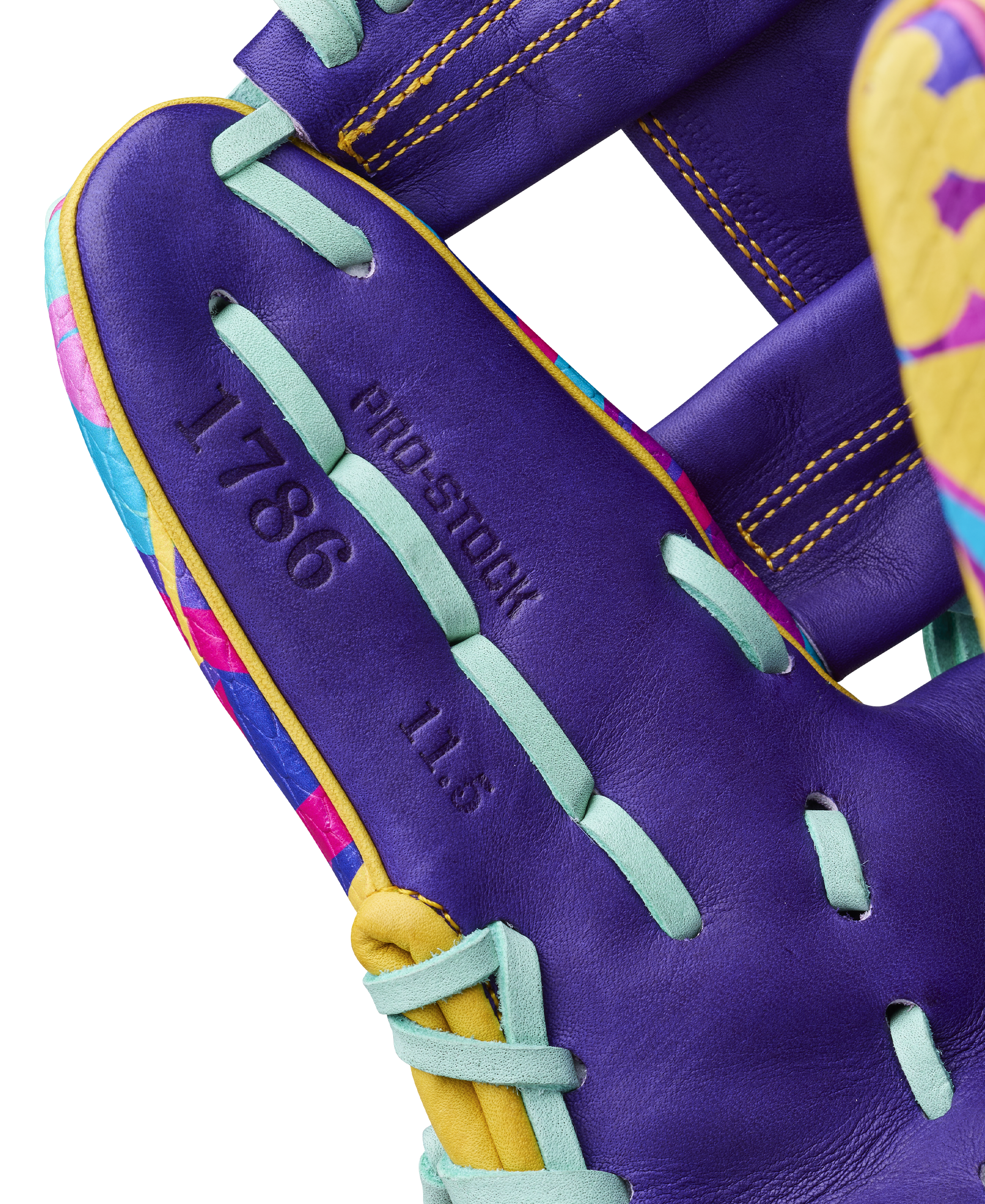 The Wilson A2000 1786 January 2026 GOTM SuperSnakeSkin 11.5" Infield Glove is a stunning limited edition piece from the renowned Wilson Glove of the Month collection. Featuring a vibrant colorway of pink, purple, gold, and teal, this glove combines eye-catching style with superior performance. Crafted with Pro Stock Leather and enhanced by a durable SuperSnakeSkin backing, it's twice as strong as regular leather, ensuring longevity and reliability on the field. Designed with infielders in mind, it boasts an I-Web design and conventional open back for optimal control and comfort, while the Dri-Lex wrist lining offers ultra-breathable, moisture-wicking properties to keep your hand cool and dry during play.