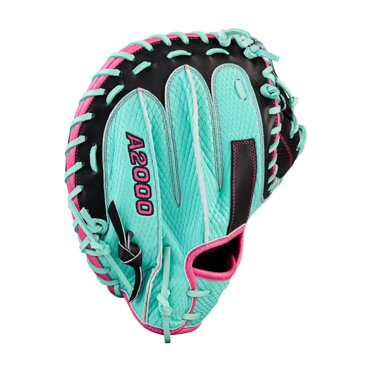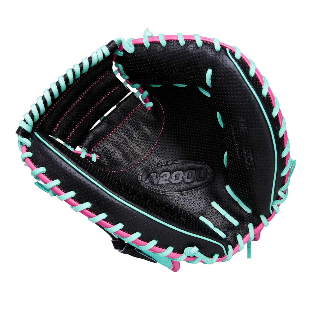 Steal strikes at the edge of the zone with the Spring 2026 A2000® SCM23SS, a catcher’s mitt optimized for thumb-up catching and pitch framing. Thinner toe pads along the fingers create a wider catching area, allowing elite backstops to set the perfect target and secure the ball. The mitt’s Black Pro Stock® leather palm and Half-Moon Web with Spin Control Technology – a patented surface texture – empowers catchers to receive the hottest fastballs or block breaking balls in the dirt, and Seafoam SuperSnakeSkin™ reduces glove weight for total control behind home plate.